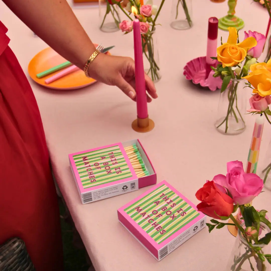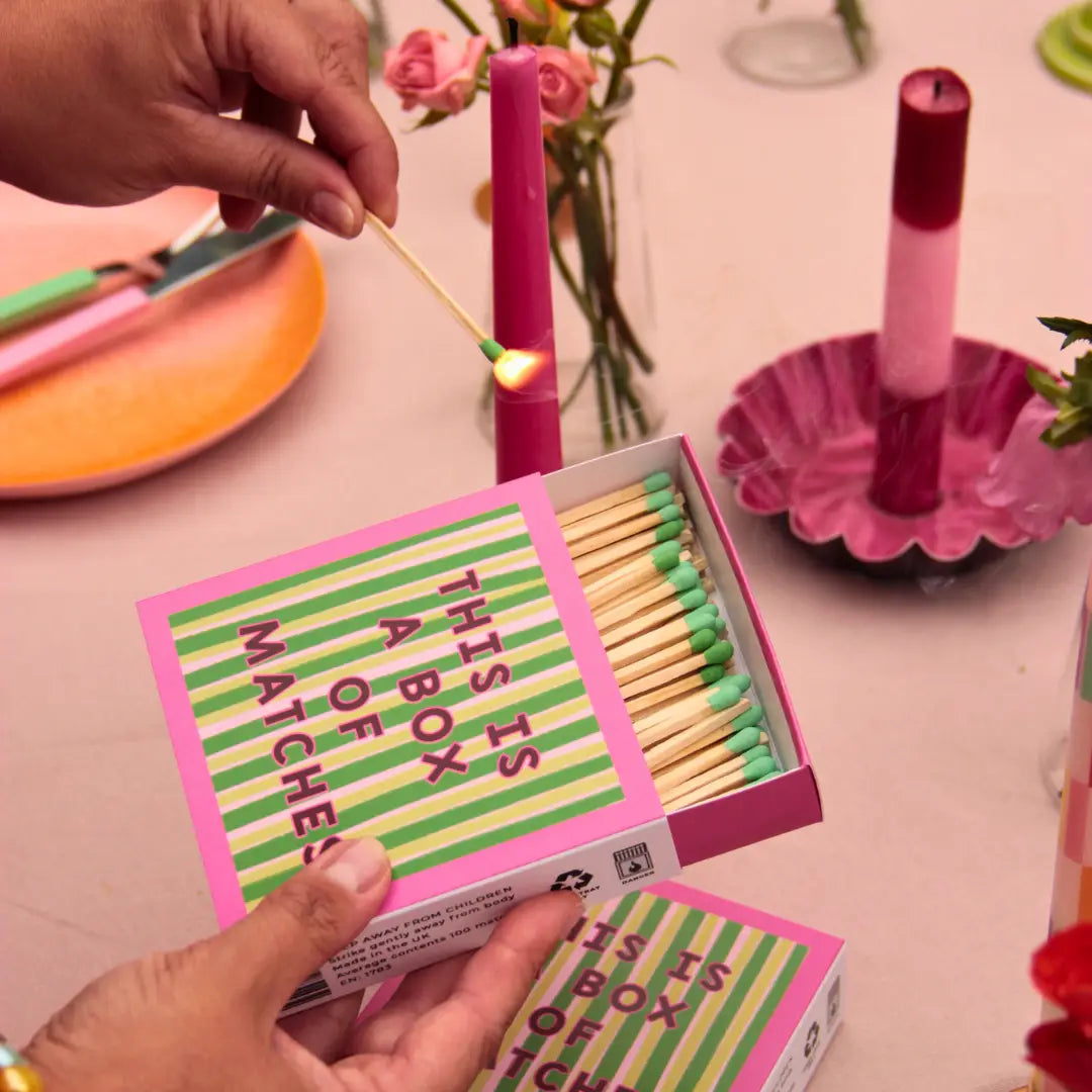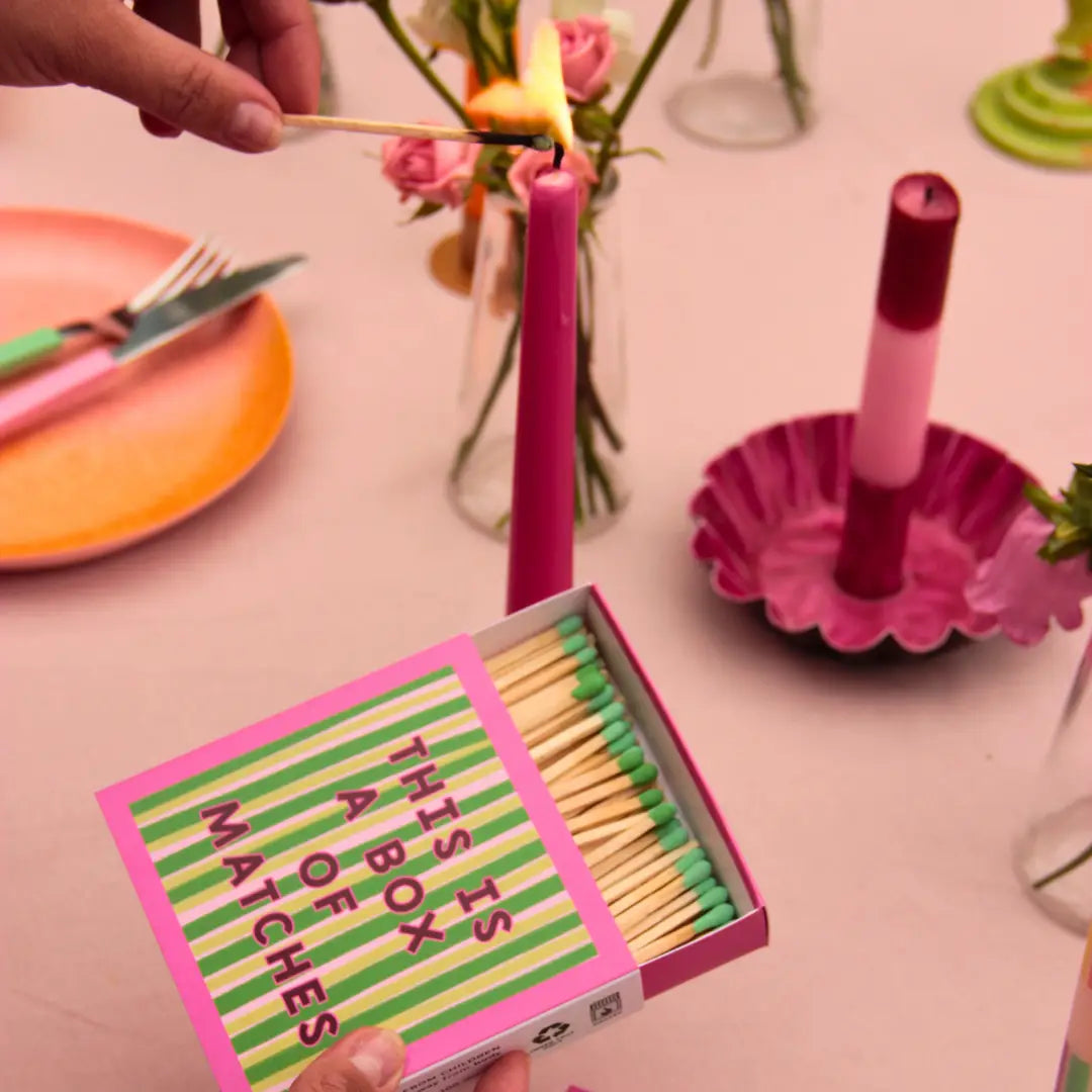 Square Matchbox with Orange Tip Matches * Designed, printed and assembled in the UK * Each box contains approximately 100 matches, each measuring 94mm Long * Secured with a sticky tab on each end * Box dimensions 110 x 110 x 30 mm