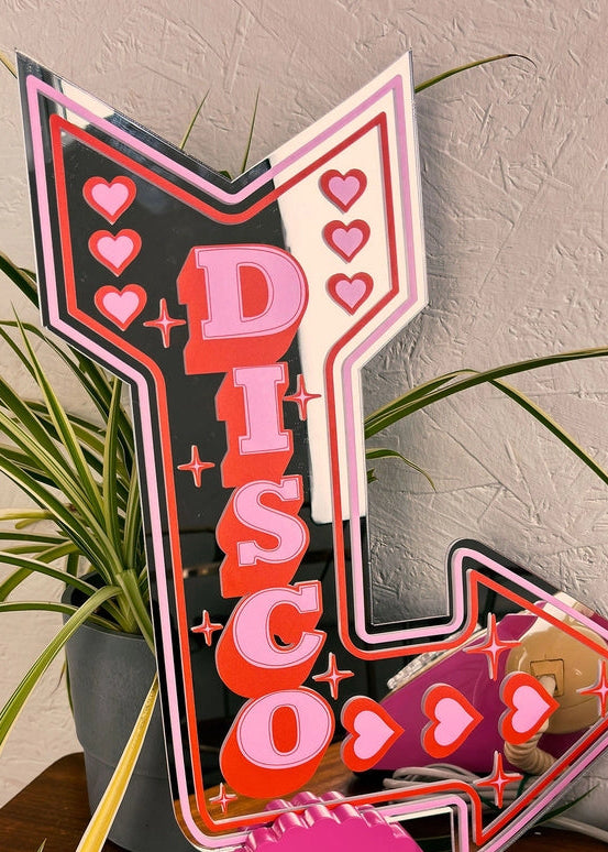Add a touch of nostalgia and quirkiness to your home with our Retro Disco Mirror, available in two sizes. Featuring a neon sign-inspired design with a playful arrow shape in pink and red, it's a fun addition to any room. Comes with COMMAND strips for hanging UV printed vinyl & acrylic mirror Small Size: 24cm x 17cm Large Size: 37cm x 29cm EU Safety Information