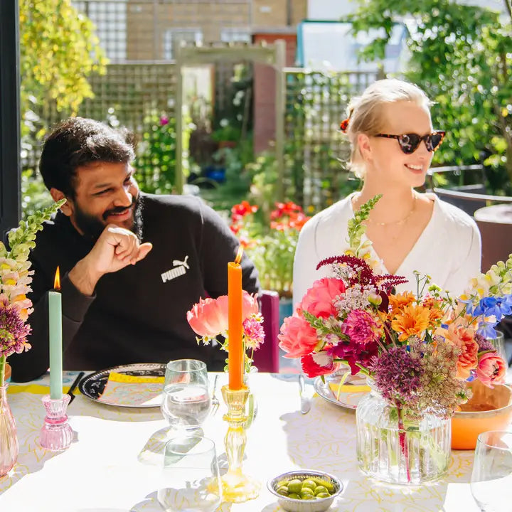 Yellow glass candlestick holder by Talking Tables. Bring the sunshine into your store with this bright yellow candle holder. The perfect table decoration, ideal for brightening a kitchen table, dining room, or mantelpiece whatever the weather outside. A lovely addition to a Spring, Summer or Gifting range, mix and match our coloured glass candle holders or pair with our glass bud vases for an eye-catching table centrepiece. . Size - 16cm height Holds 2cm candle depth and 2cm width
