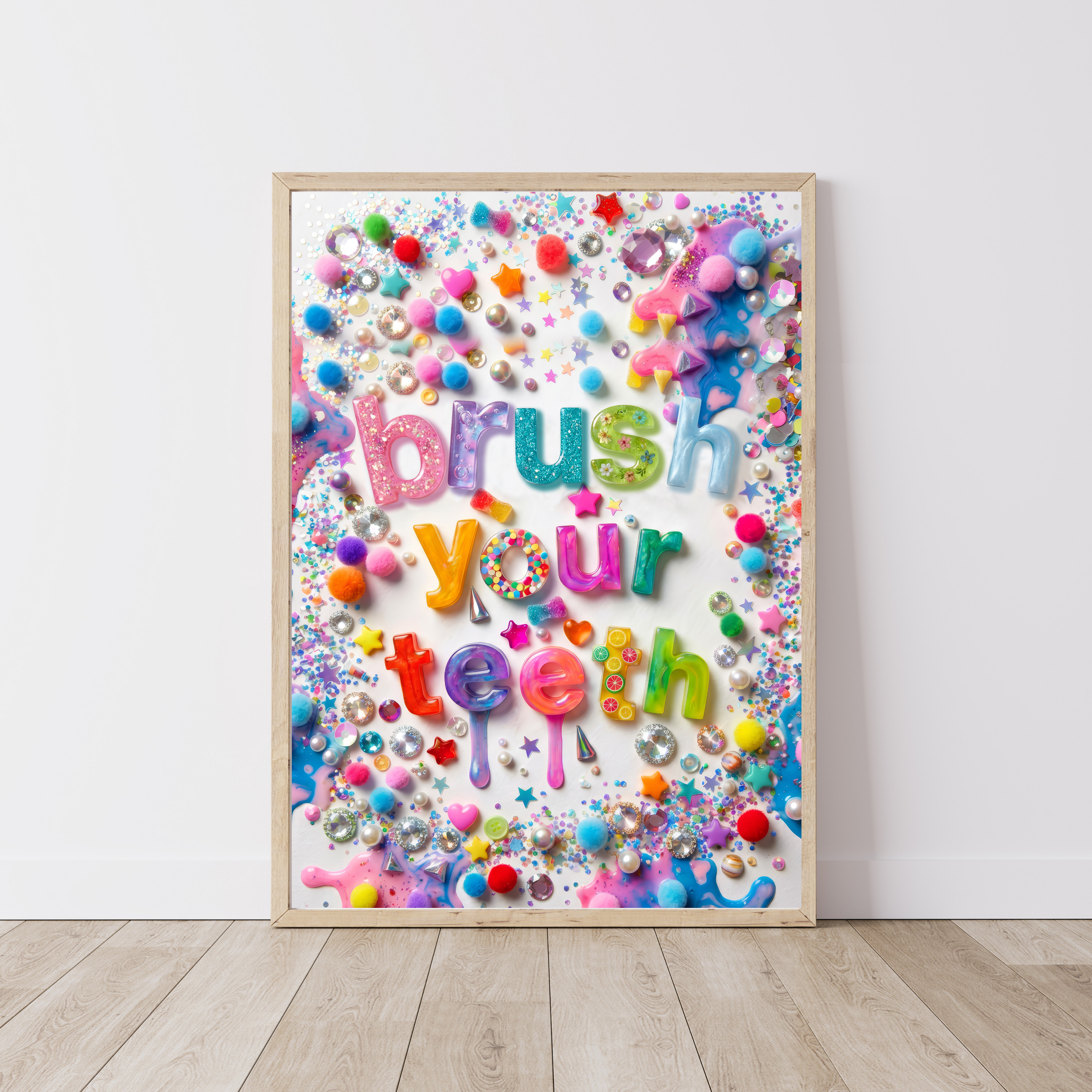 Discover our enchanting new print series. This new collection is bursting with vibrant colours, shimmering glitter and cutie embellishments. This original design is perfect or adding a touch of joy and sparkle to any space or ideal as a gift!