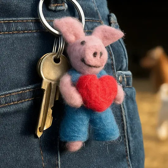This adorable piglet keyring is a charming handmade accessory crafted with traditional needle felting techniques in Nepal. Made from 100% New Zealand Sheep’s wool, this piglet is dressed in bright blue overalls, while holding a vibrant needle felted red heart close to its chest. Attached to a metal keyring, this cute felted piglet makes a perfect gift or personal keepsake, ideal for adding a touch of whimsy and affection to your keys, bag, or backpack.